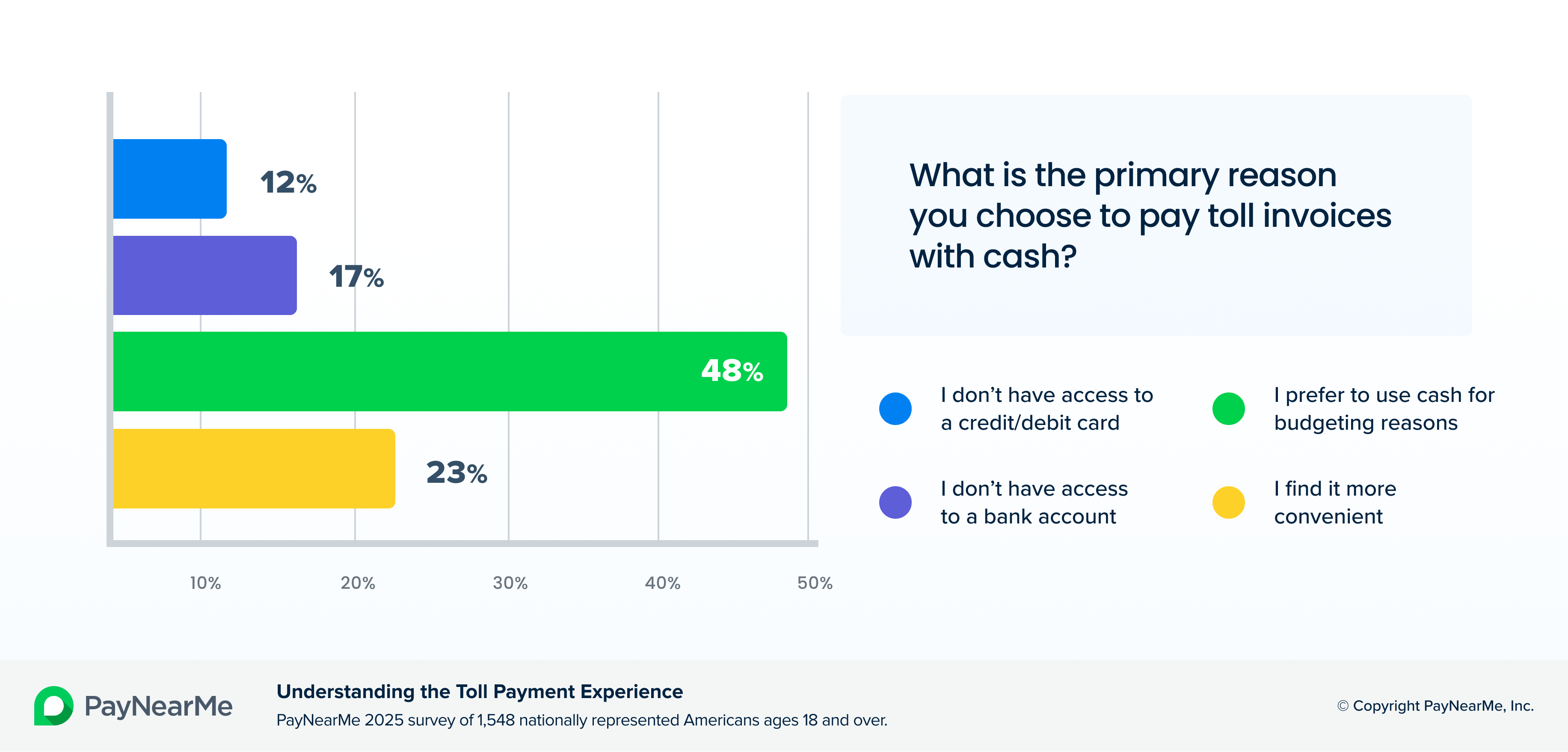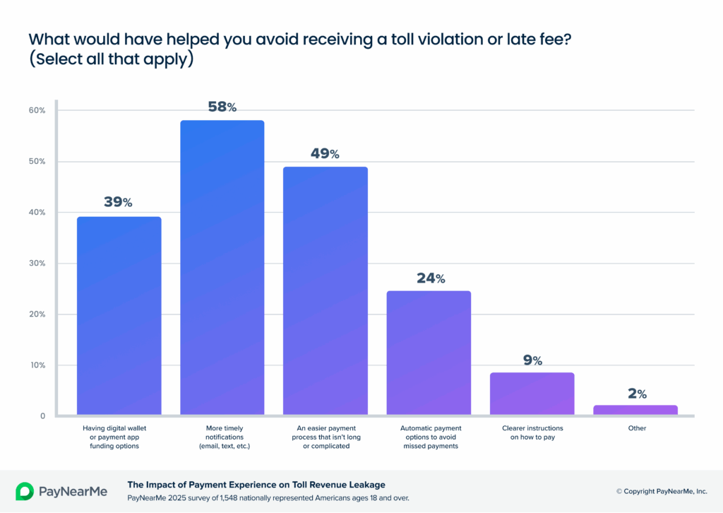 In 2026, agencies can no longer treat “modernizing payments” as innovation—low-effort payments are table stakes. Drivers increasingly compare every toll payment experience to the speed and simplicity of ecommerce checkouts, and PayNearMe’s tolling research shows that long, complicated flows are a leading reason people delay or avoid paying toll invoices. Nearly one in three drivers say the payment process itself is difficult or inconvenient, and many cite limited payment options—especially the absence of digital wallets—as a source of frustration.