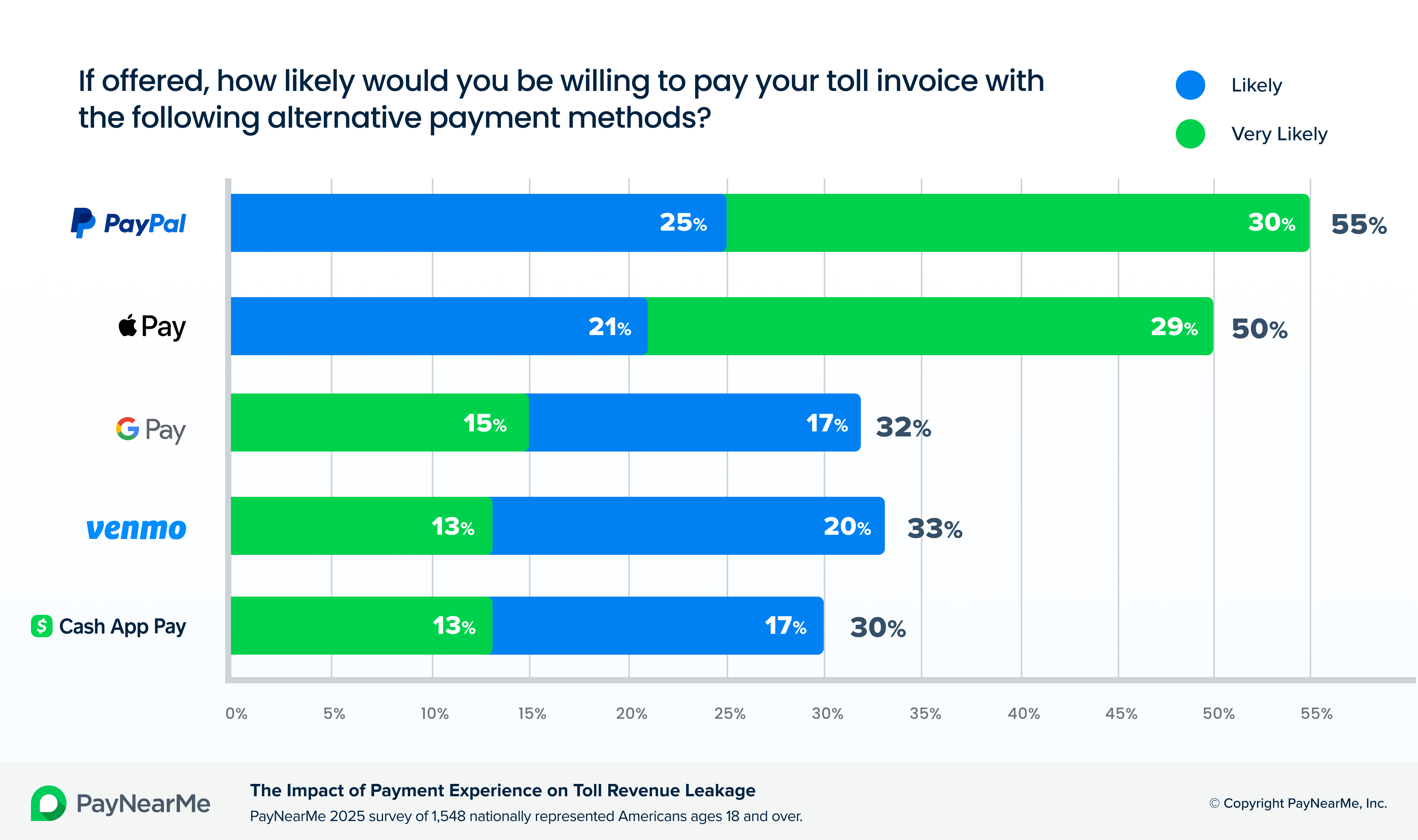 - Apple Pay, Google Pay, PayPal, Venmo and other “native” digital wallets, which consumers repeatedly cite as missing from today’s toll payment experience