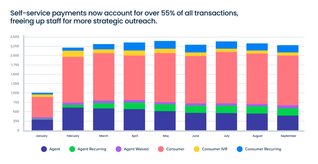 - Self-service payments now account for over 55% of all transactions, freeing up staff for more strategic outreach.