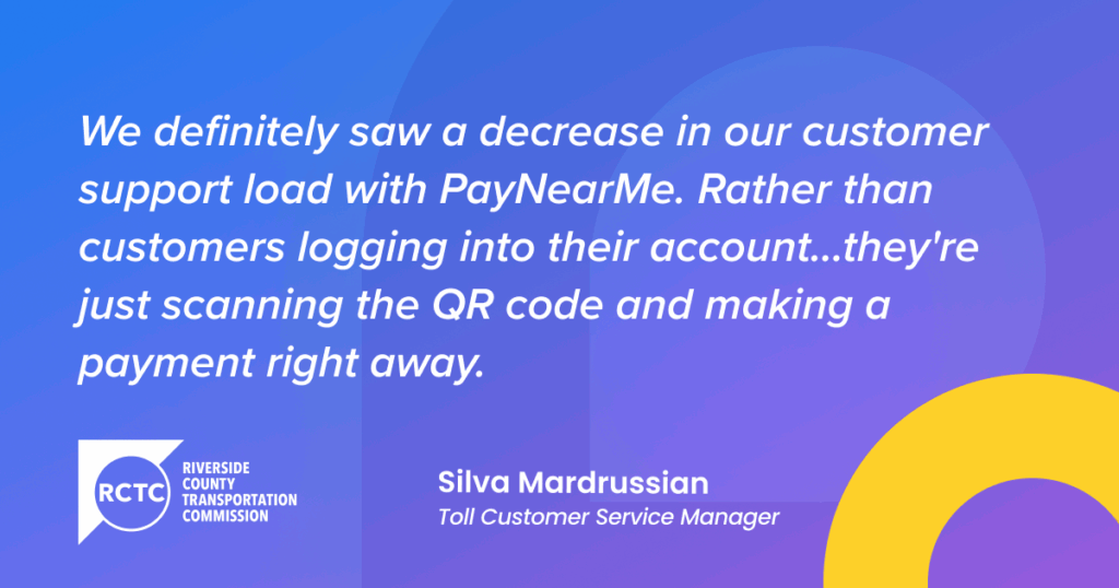 Personalized payment links via QR codes printed on invoices helped one of PayNearMe’s tolling clients, The Toll Roads, collect more unpaid tolls significantly faster. The Transportation Corridor Agencies (TCA) planned, built, financed, constructed and continue to operate the roads, which make up 20% of Orange County’s highway system. For drivers who prefer using cash or having an additional option to pay tolls, replenish a FasTrak account or resolve a toll violation, TCA expanded its appeal to consumers by partnering with PayNearMe.